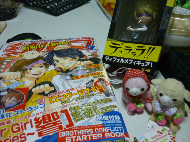 しばらくぶりです。 最近の出来事をまとめて書きます! まずDGSのイベント行ってきました!当日は生憎の雨でしたが、たっぷり楽しめました。小野Dがいちいちハンサムで神谷は可愛かった。くまの靴は反則です。あとはボディタッチの多さにニヤニヤ。onkmフラグ!!あとは小野D聖誕祭もイベント内での収録でした。本人を目の前にして誕生日を祝えて、すっごく嬉しかった!あまりの楽しさにイベント終了後は声が枯れてしまうほど。私と一緒に行ったじゅんじゅんこと翡翠潤さんのブログにはイベントの内容が詳しく書かれているので気になる方はそちらへ。 つぎ、スパコミに行ってきました。ほんとは行く予定がなかったんですが、じゅんじゅんと電話してるうちに行きたくなり急遽行くことに。と言っても3日だけの参加です。デュラは大手さんなら書店で買えますが、声優ジャンルはそうはいかないので;冬は直接スペースに行けず、買い物を頼んだのでリベンジ!持っていったお金がすべて空になるほど買い漁りましたw主にonkmですがnmonサークルでsgon要素と取れる本を発見し購入。絵も好みだったので俺得!思った以上に買ってしまい手提げかばんが重いこと。いや嬉しい重さです。お財布は寂しいですが。。この日はお互い仕事だったので早めに解散しました。雨も心配でしたし。仕事に行くまでも戦利品を読みふけってニヤニヤ。久々に良い買い物をしたw つぎ、今期アニメの好きキャラ。最近ベルゼブブが可愛くて仕方がないです!アザゼルさんは神谷出るからって見始めたんですがべーやんがあまりにも可愛くてw4話のカッパべーやんが可愛くて悶えました。何あの可愛さ。犯罪級!べーやんのぬいぐるみとかあったらめっさ欲しい。佐隈さんみたいにぎゅってしたい!あとは日常のはかせとなの。あの白衣をひきずってる感じとか、なのの腕からバームクーヘン出しちゃうとことか。可愛い。癒される。幼女かわゆすです。←変態だ。あと日常はOPがヒャダインってこともお気に入りの理由。ヒャダイン好きなので。他はAチャンネルのとーると佐藤先生。あの袖が余ってるセーターが可愛い。あとちっちゃいし。佐藤先生は中の人が小野Dってことで。変態っぽいとこもあるので声があってる。 GWはまともになかったですがそれなりに楽しめました。みなさんはどうでしたか?